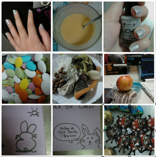 1. Manicure com verniz novo da Cliché (Angora) | 2. Tempura para o almoço | 3. Verniz novo da cliché | 4. Amêndoas de chocolate acabadinhas de chegar | 5. Cozido à portuguesa para o almoço | 6. Jantar do Dexter... altamente saudável | 7. Um coelhinho a ver o sol | 8. Uma boa Páscoa | 9. Comboio de joaninhas de chocolate