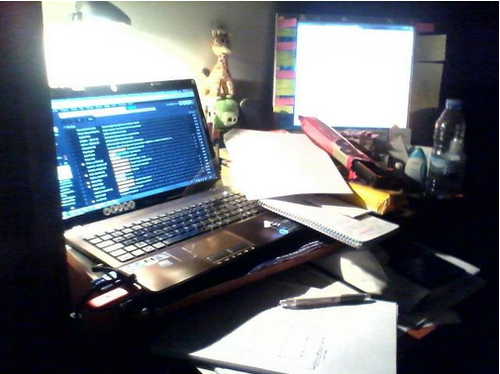 O problema é que nem assim me vejo livre do papel, até porque em algumas coisas continuo a ser algo antiquada e os velhos hábitos são difíceis de matar... mas faço reciclagem de tudo prometo. E assim se explica a explosão de coisas na secretária que variavam entre livros, folhas, cadernos, blocos de notas e claro os meus pacotes de bolachas, garrafa de água e sei lá eu mais o que raio anda perdido nesta secretária... mas o caos maior é de ontem à noite que fui dispondo papelada por cima das minhas pilhas estratégicamente arrumadas empilhadas.