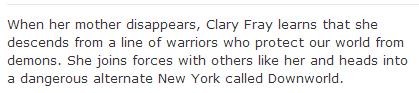 Clary Fray é uma moça perfeitamente normal até que começa a desenhar o mesmo símbolo vezes e vezes sem conta. Quando a sua mãe desaparece tudo o que ela pensa ser normal é substituído por um novo estranho mundo paralelo ao seu.