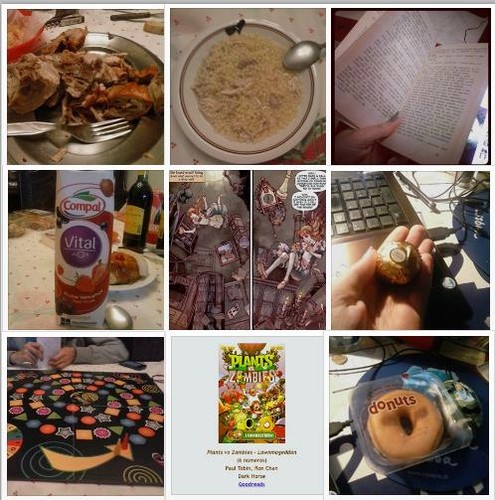 1. leitão assado *-* || 2. Canjinha boa ||3. "O Senhor dos Sonhos" de Roger Zelanzy ||4. Compal de frutos vermelhos ai que bom *-* || 5. A ler a "Alice no País das Maravilhas" em BD || 6. O Primeiro Ferrero Rocher deste inverno || 7. Mais uma manhã de jogos de tabuleiro com os putos || 8. Uma das leituras mais divertidas de sempre "Plants vs Zombies" em BD || 9. DONUTS!