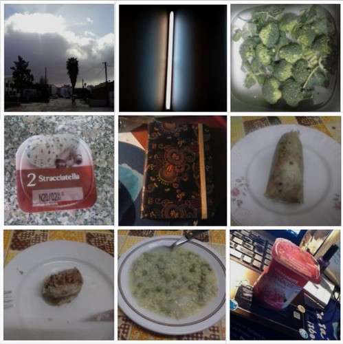 1- Segunda-feira nublada mas com o sol a espreitar... | 2- Noite a olhar para o tecto à procura da inspiração divina para trabalhar... | 3- Bróculos *-* | 4- Estes iogurtes do continente são tão bons *-* | 5- o meu novo bloco de notas | 6 e 7- Maranhos para matar a saudade | 8- Canja com ervilhas nham | 9- Mais iogurte :p
