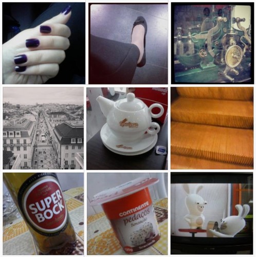 1- A manicure da semana (Meia-noite da Cliché) | 2- Fartei-me das botas e calcei sabrinas... a coisa correu bem até ao final da tarde, quando começou a chover | 3- Clockwork :p | 4- Lisboa vista do miradouro | 5- Bule de chá de menta e mel na minha pastelaria favorita. Uma excelente forma de trabalhar e ver a chuva a cair lá fora | 6- Escadas rolantes na Baixa-Chiado, só porque sim | 7- Uma Super Bock para acompanhar a comida cai sempre bem | 8- Mais iogurtes xD | 9- Uma descoberta no canal Nickelodeon enquanto passava a ferro: RABBID RABBITS!!