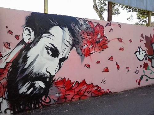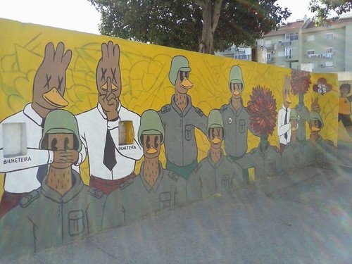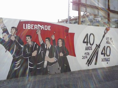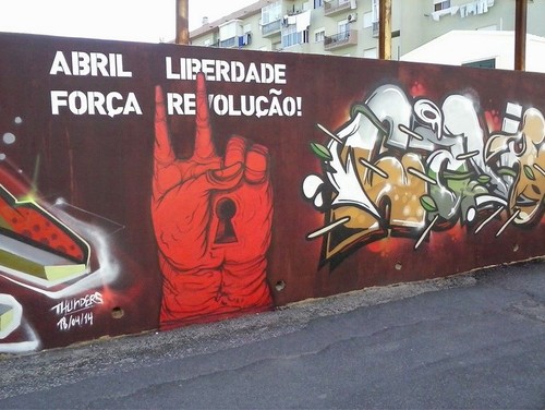 Ora bem, em Loures decidiram renovar o muro do campo de futebol do Grupo Desportivo de Loures (é assim que se chama, não é?) e cobri-lo com graffiti, relacionados com o 25 de Abril.