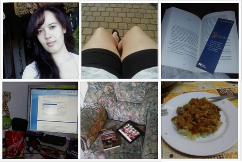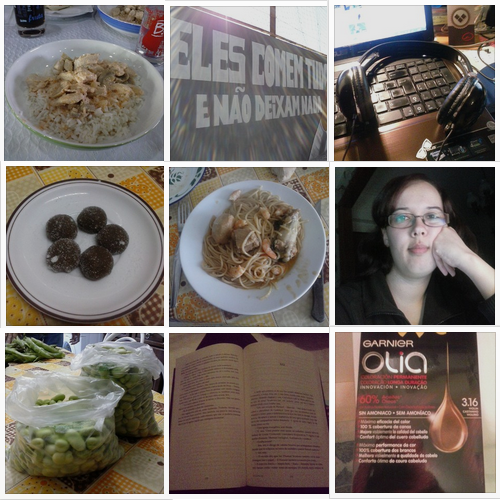 1. Resultado da mudança de cor (depois mostro mais detalhes) \2. Apanhar sol... que booooooom *-* \3. Nada melhor que terminar um dia com um livrinho bom\4. Tarde de Domingo, depois do trabalho feito foi hora de me atirar à tese e de engolir tudo com chocolates \5. E porque é necessário parar e descansar antes de começar mais uma semana, nada melhor que reservar o sofá com um bom livro e o extintor portátil \9. E uma pausa na leitura para comer a especialidade do papá nhammm