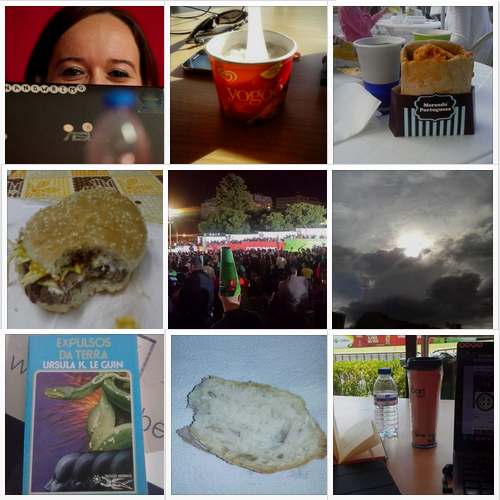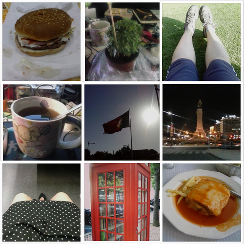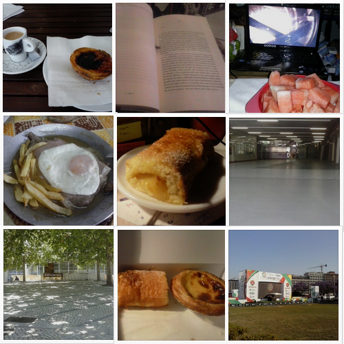 1. Snacks depois de um dia e noite de muito trabalho \2. Também tenho um manjerico! \3. A vantagem de se trabalhar no iPad :p \4. Chá para ajudar a aguentar mais umas horas de trabalho \5. Bandeira nacional \6. O fim de mais uma noite \7. Farta de calças e calções \8. Finalmente encontrei uma biblioteca! \9. Francesinha *-*