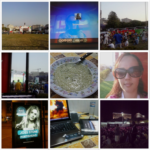 1. A vista do relvado que acabou por se tornar quase a segunda casa :p \2. Só porque trabalhar de óculos de sol é mais cool xD \3. Com o Brasil há sempre festa no Futebol Park \4. E assim se vê a bola \5. canja *-* \6. Mais um dia no Futebol Park \7. Olha a Joss Stone na paragem do autocarro! \8. Escritório improvisado na cozinha... \9. Dias awesome com festa garantida