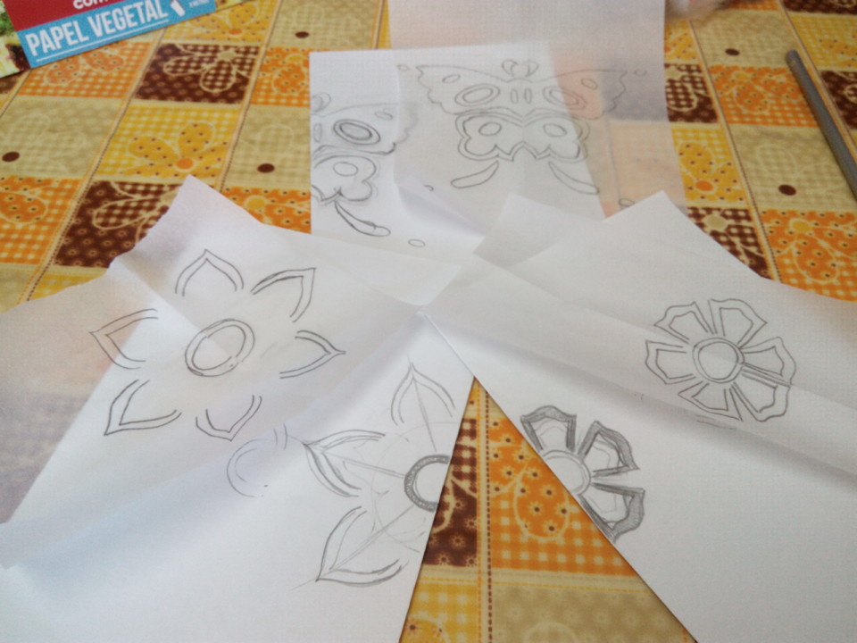 Fiz os desenhos em papel vegetal e com muita paciência passei para o vestido um a um antes de pintar.