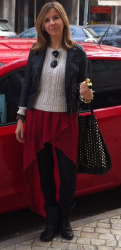 Diria que é uma tentativa de juntar a camisola tricotada pela avó com um vestido que vemos no Resident Evil. Por cima temos então o clássico blusão de ganga que deve ficar bem com o carro que está do outro lado da rua e uma mala que se lhe bater o sol cega qualquer pessoa que esteja perto...