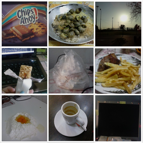 1- tablete de milka com chips Ahoy! (é bom) \ 2- Uma bela dose de caracoletas nham nham \ 3- Sol pela manhã \ 4-barra de cereais para repôr energias \ 5- suspiro XXXXXXL \6- Porco no forno com batatas fritas \ 7- Eu prestes a amassar massa para fazer uma bola de carne \ 8- Um café no final de um longo dia \ 9- Desligar o 2º monitor para um fim-de-semana de relax